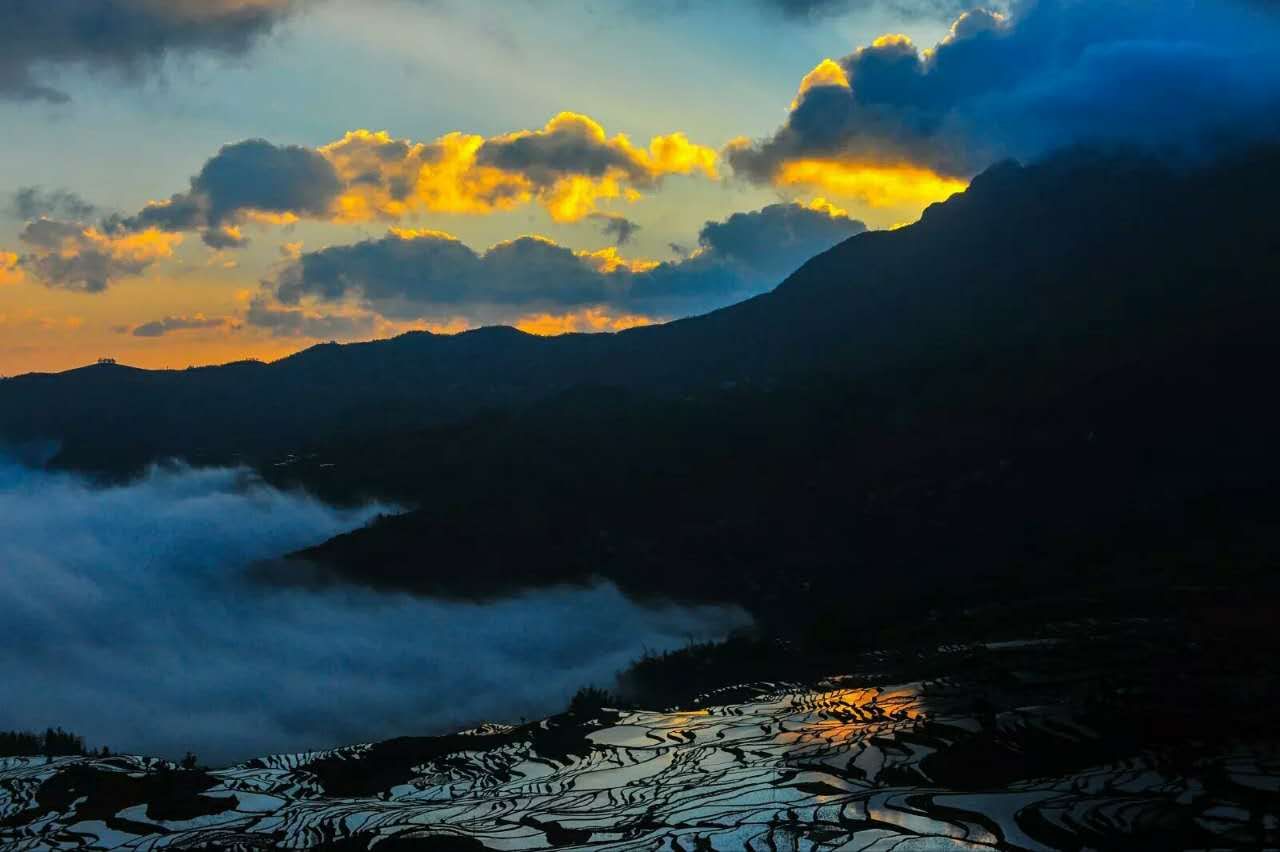 云海是元阳梯田景观不可缺少的组成部分,缺少了云海的点缀,梯田将不再神秘,不再飘逸,不再有神韵。元阳云海不分四季,按当地人说法,它爱来就来,不爱来就到太阳窝里串门,或被风雨拽走。但是在元阳的冬季,云海却常常驻留在梯田间流连忘返,把梯田隐没在一片云雾中,赋予梯田神秘、飘渺的神韵。元阳的云海气势磅礴,在阳光的照射下,在峡谷气流的作用下,像绸缎、像胭脂、时而风起云涌,变幻莫测,时而如惊涛骇浪,汹涌澎湃,似海非海,美不胜收。当云雾散尽,峡谷空旷,蘑菇房点缀其中,青山、绿水、梯田、蘑菇房构成了一道神奇而美妙的画卷。
